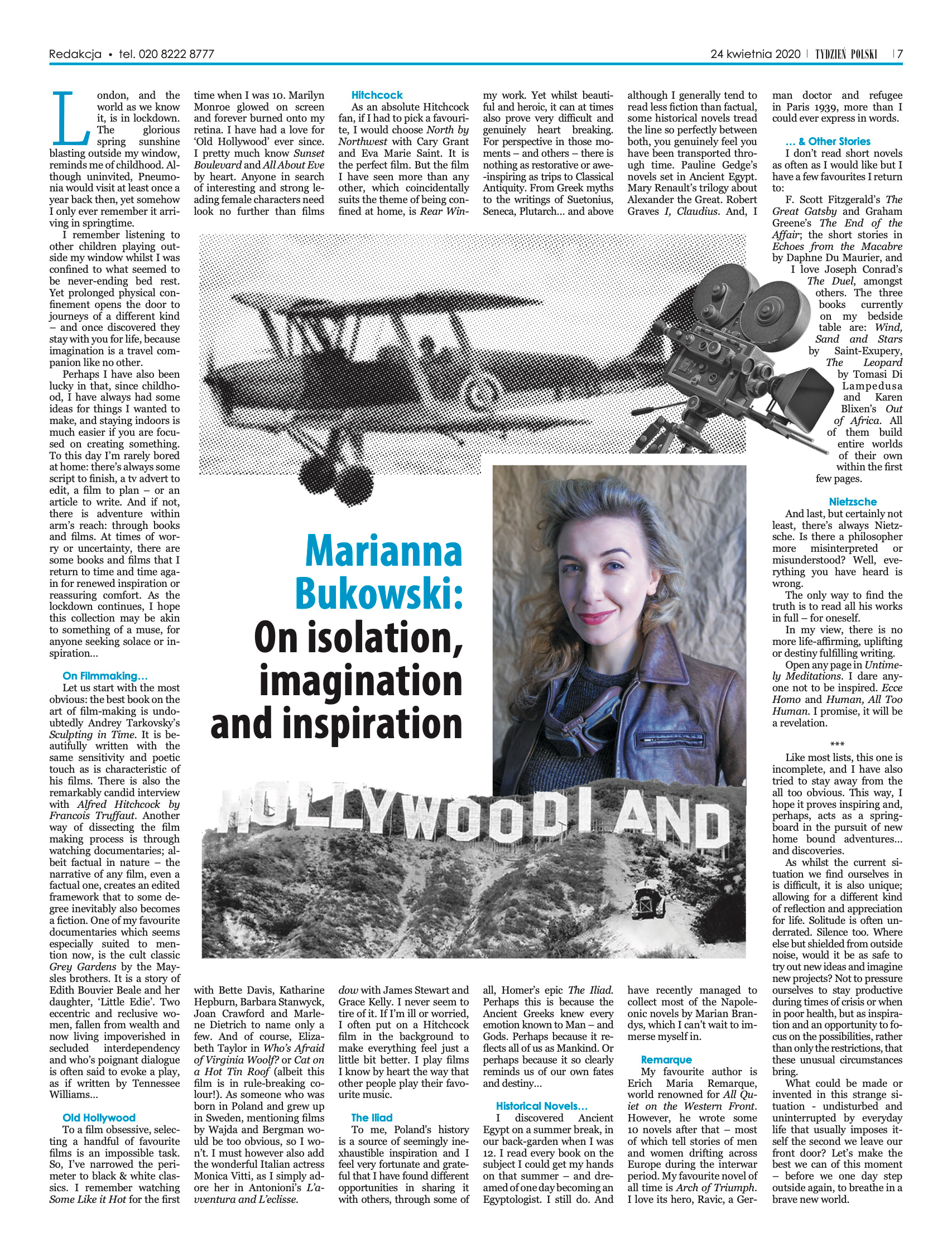 Imaginary Adventures in Lockdown: Favourite Books and Films. By Marianna Bukowski for Tydzien Polski (Polish Weekly) newspaper (1300 words, English) Published in print issue, April 2020.