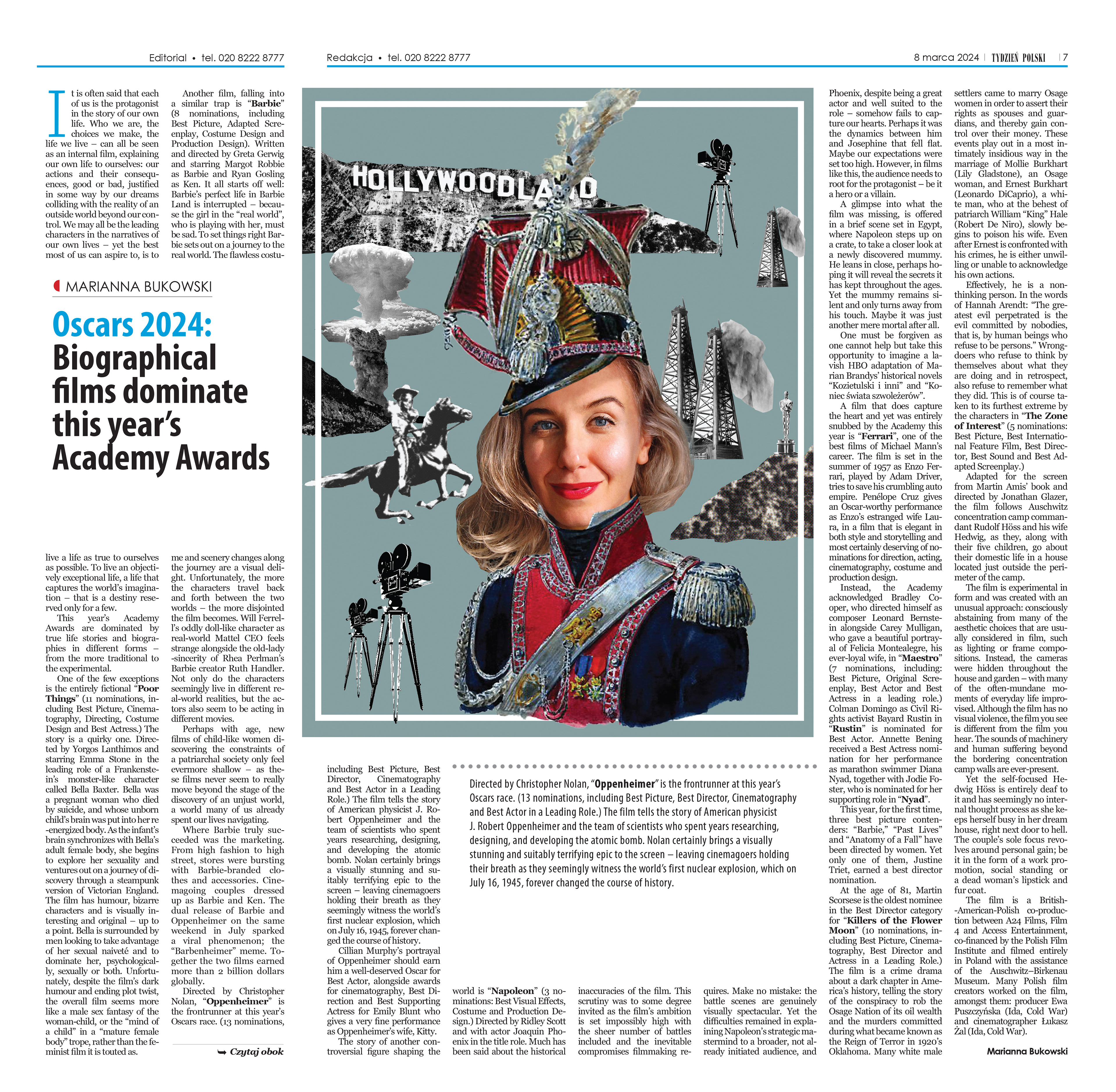 Cover feature: Oscars 2024 film review by Marianna Bukowski for Tydzien Polski / The Polish Weekly. (1600 words, English). Published in print issue March 2024.